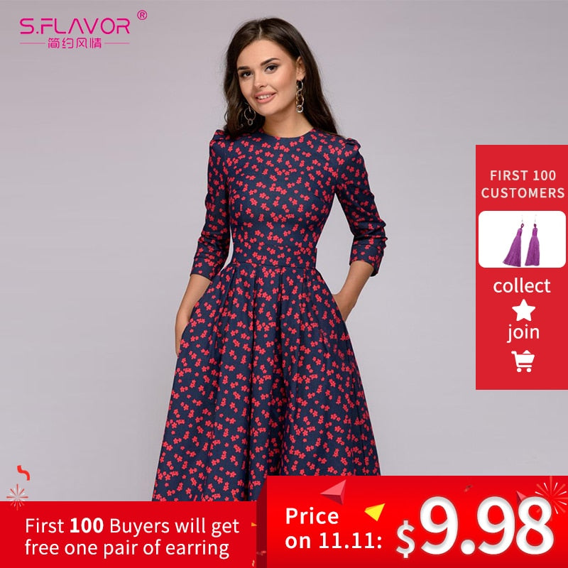 S.FLAVOR Women Elegant A-line Dress 2019 Vintage printing party vestidos Three Quarter Sleeve women Slim Autumn Winter Dress